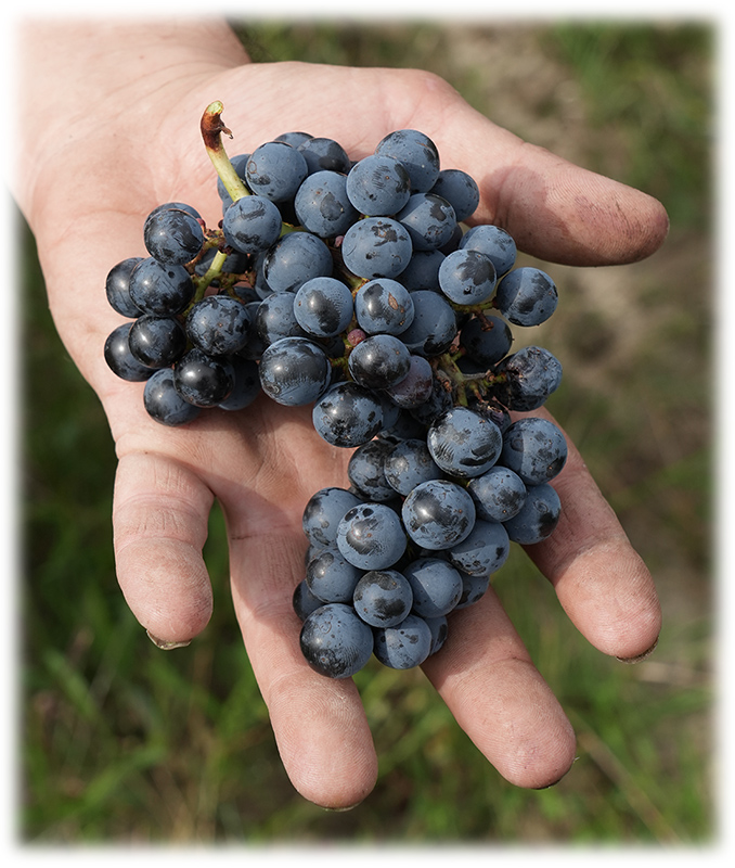 La récolte 2023 s’est déroulée seulement quelques mois trop courts après l’acquisition des parcelles (qui n’avaient pas été travaillées depuis la récolte 2022) et sous pression du mildiou très présent cette année-là. Avec une attention particulière, pratiquant une cueillette sélective et un tri rigoureux directement sur la vigne, nous avons tenu à réaliser un test. Malgré les défis, de belles grappes de merlot (trop rares) et quelques-unes de Côt (Malbec) ont permis de vinifier un vin prometteur qui attend tranquillement dans des dames-jeannes (bonbonnes
